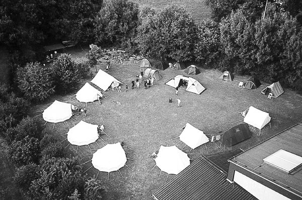 Gute Laune im Zeltlager: Zwar stand diese Behausung einmal unter Wasser, doch ziemlich schnell war das Unglück vergessen. |