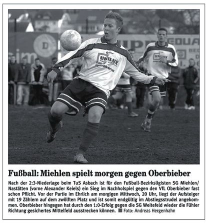Bezirksliga Ost Sportfreunde Neitersen - SG Miehlen / Nastätten. Miehlens Trainer Günther Wessely, der am Sonntag aus dienstlichen Gründen nicht zur Verfügung stehen und nach eigenen Aussagen vermutlich von Abteilungsleiter Stefan Müller an der Seitenlinie vertreten wird, brach aber nach dem 2:0-Heimsieg gegen die SG Weitefeld nicht in grenzenlose Euphorie aus. "Ein großer Schritt war das nicht, wir haben uns lediglich die Chancen erhalten, doch noch drinzubleiben." Wessely baut darauf, dass die Oberwesterwälder nicht mehr hundertprozentig bei der Sache sind, nachdem sie den Sprung in die Rheinlandliga perfekt gemacht haben. Seit der nämlich fest steht, setzte es zwei Niederlagen. "Darin liegt unsere kleine Chance. Wir müssen uns aber auch darüber im Klaren sein, dass uns wahrscheinlich nur sechs Punkte aus den beiden ausstehenden Spielen weiter helfen, zudem müssen unsere Konkurrenten für uns spielen." Gastgeschenke stellt Sportfreunde-Coach Maik Rumpel jedoch keine in Aussicht. "Wir wollen uns mit einer engagierten und konzentrierten Leistung von unserem Publikum verabschieden und das Spiel gewinnen. Dazu müssen wir allerdings unsere Chancen konsequenter nutzen als letzte Woche in Neuwied", sagt Rumpel, der bis auf den gesperrten Günter Gerhardt alle Spieler an Bord hat. Bei den Miehlenern fehlen werden Dominik Hillenbrand, Manuel Reinhardt und Steffen Schmidt - er wandert zusammen mit Alexander Best zum benachbarten B-Ligisten TuS Singhofen. Dafür steht Waldemar Hass wieder zur Verfügung. Im Gegensatz zu Michael Kapski, der der SG nach einigen Gesprächen einen Korb gegeben hat. Die Trainersuche geht im Ehrlich also wieder von vorne los. |