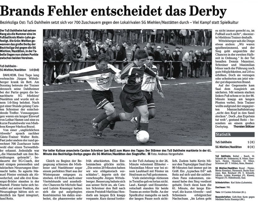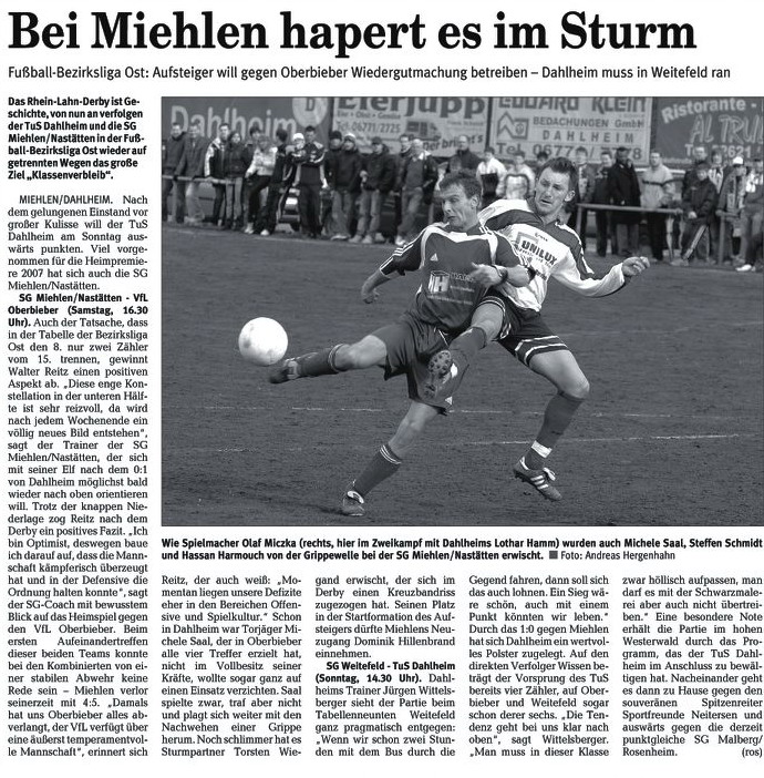 "In dieser Partie sind wir trotz des Heimvorteils lediglich Außenseiter", sagt Reitz und verweist auf die "Riesen-Rückrunde" der Mannschaft von Trainer Jürgen Wittelsberger. "Ich denke, dass die Dahlheimer schon wieder annähernd auf diesem Niveau spielen", warnt Reitz seine Schützlinge, "die zum jetzigen Zeitpunkt eigentlich noch nicht gegen solches Team gewinnen können". Fragt man indes TuS-Übungsleiter Wittelsberger nach den Kräfteverhältnissen, hört sich das gänzlich anders an. "Ein Pünktchen wäre schön, aber es wird verdammt schwer, in Miehlen etwas zu holen", weist auch er die Favoritenrolle von sich. Insbesondere die Einschätzung des Kollegen Reitz, der TuS sei schon wieder auf dem Stand der Vorsaison, will Wittelsberger nicht teilen. "Große Teile der Mannschaft haben noch einen erheblichen Trainingsrückstand. Wir müssen daher versuchen, uns noch vier, fünf Wochen über Wasser zu halten." Entsprechend erleichtert ist der Coach, auch heute im Derby auf seine Standby-Kraft Lothar Hamm vertrauen zu können. "Lothar ist fit und hat beim 3:2 gegen Neuwied ganz stark gespielt", sagt Wittelsberger, der den gesperrten Libero Tobias Busch durch den erfahrenen Sascha Oestreich ersetzen wird. Ohne seinen Routinier im Mittelfeld wird Walter Reitz auskommen müssen. Marinko Valentic hatte sich beim 4:0-Auftaktsieg gegen Ellingen einen Muskelfaserriss zugezogen und wird heute ebenso zuschauen wie der angeschlagene Alexander Keiels. (ros)