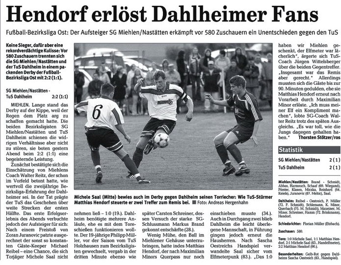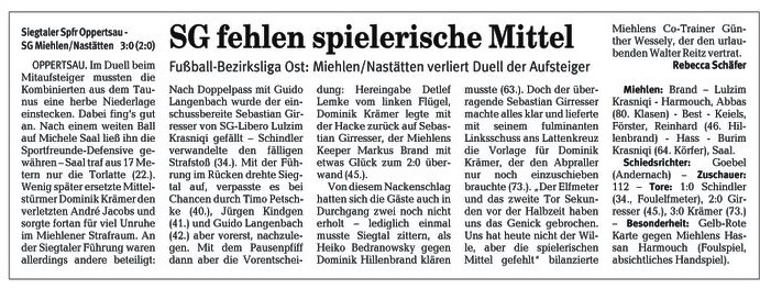 Miehlen/Nastätten: Brand - Schmidt - Harmouch, Abbas - Schaaf, Klasen, Miczka, Förster, Reinhard (88. Mehic) - Juranovic (81. Wiegand), Saal. Schiedsrichter: Matthias Eschenauer (Bad Marienberg). Zuschauer: 103. Tore: 0:1 Thomas Schaaf (69.). |
