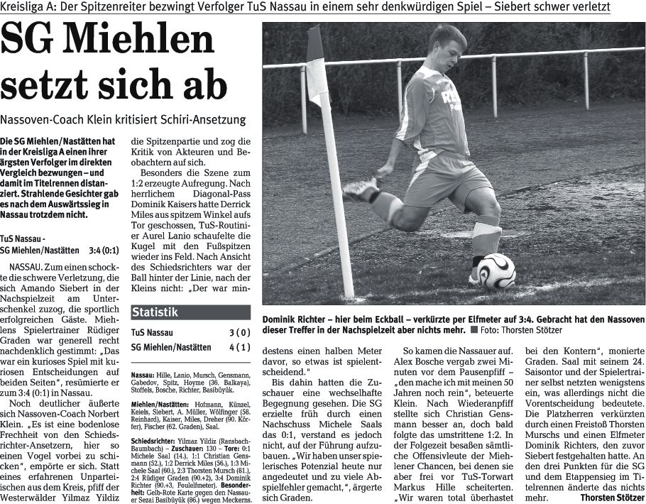 - Nassau 6:2 SG Miehlen/Nastätten: Hofmann, Reinhardt (86. Mayer), Körfer, Künzel, C. Müller, Flemming (74. Fischer), A. Müller (82. Crecelius), Siebert, Miles, Dreher, Saal. TuS Nassau: Hille, Mursch, Gensmann, Bebbon, Lanio, Ates (77. Gabedov), Richter, Spitz, Rojna (77. Hoyme), Basibüyük, Stoffels (77. Masendorf). Tore: 0:1 Daniel Körfer (4. Eigentor), 1:1 Sven Flemming (7.), 2:1 Michele Saal (12.), 2:2 Cem Ates (39.), 3:2 Derrik Miles (55.), 4:2, 5:2, 6:2 alle Michele Saal (64., 74., 81.) - Schiedsrichter: Arnulf Döbbert (Weisel) - Zuschauer: 150 - Zitat: "Trotz schlechtem Spiel ein klarer Sieg", kommentierte SG-Trainer Günther Wessely. 14.09.08 |