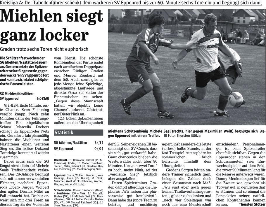 - Miehlen 1:5 SV Eppenrod: Sturm, Könighaus, Lotz, Wölbert, Klein, Wollenhaupt (46. Werner), Nink, Daubach (60. Hofmann), Mäncher, Bielec, Brötz (85. Friedrich). SG Miehlen/Nastätten: Hofmann, Wölfinger (55. Reinhard), Siebert, Künzel, Keiels, Kaiser, Miles, A. Müller, Flemming (75. Ch. Müller), Dreher, Saal (55. Fischer). Tore: 0:1 Sven Flemming (12.), 0:2 Marcello Dreher (15.), 0:3 Sven Flemming (30.), 0:4 Alexander Keiels (47.), 0:5 Sven Flemming (70.), 1:5 Jochen Friedrich (86.) - Schiedsrichter: Bernhard Lohrum (Diez) - Zuschauer: 100. 15.03.2009 |