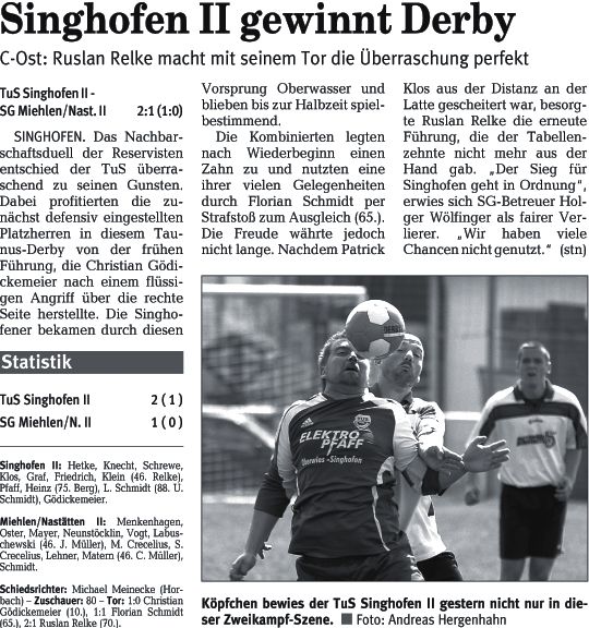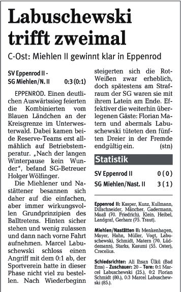Heistenbach - Miehlen II 5:1 Tore: 0:1 Darius Starks (30.), 1:1 Klaus Schmid (48.), 2:1 Jonathan Schwarz (60.), 3:1 Frank Schlosser (65.), 4:1 Dominik Dehling (75.), 5:1 Marco Hinsdorff (84.) - Schiedsrichter: Martin Töpfer (Kaltenholzhausen) - Zuschauer: 45 - Vorkommnisse: Christopher John (20., 67.), Klaus Schmid (32., 72.) und Rainer Kumpies (86.) trafen alle für Heistenbach die Latte. |