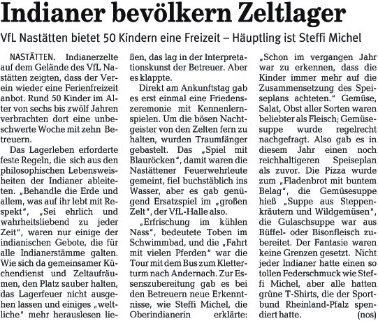 VfL Nastätten Auf den Spuren der Indianer Vor vielen Monden rief Häuptling Steffi Michel (Adlerfeder) ihre Stammesbrüder zwischen 6 und 12 Jahren zu einem Zeltlager des VfL Nastätten vom 23. bis 28.06. 2008 zusammen. Aus allen Teilen des weiten Blauen Ländchens kamen sie zusammen: Kleiner Wolf, Stinkende Socke, Große Schlafmütze und viele andere, um 5 Tage im Lager zu beraten, tanzen, zu spielen und ihre Kräfte zu messen. In sengender Hitze bauten sie am 1. Sonnenaufgang gemeinsam mit dem Künstler Mannu ihre Trommeln, spannten Büffelfelle auf selbst gefertigte Holzrahmen und gestalteten dekorativen, farbenfrohen Schmuck aus selbst hergestelltem Filz. Kurz vor Sonnenuntergang trommelten Adlerfeder und ihre Unterhäuptlinge die Stammesbrüder zusammen, um auf dem Pfad der Bäume mithilfe des Großen Manitu zur Siedlung des weißen Freundes Ulrich Bayer zu wandern. Dort verzehrten sie mit großem Appetit neuzeitliche Fladen, gefüllt mit Bisonfleisch und Gartengemüse. Sie dankten den Gastgebern mit einem Indianertanz und sangen, musikalisch begleitet von Bernd Bott, fröhliche Lieder. Am folgenden Tag übten sich die KriegerInnen im Fort Hahnenmühle in Fluss- und Schluchtenüberquerung sowie Kisten stapeln. Sie bewiesen dabei großen Mut und Geschicklichkeit. Viele Übungen trugen zum Zusammenhalt des Stammes bei. Bevor sie sich in ihren Tipis zur Nachtruhe begaben, konnten sich die KriegerInnen bei dem Film "Die Bärenbrüder" entspannen. Am Morgen des 3. Tages erfrischten sich alle in den Fluten des Waldschwimmbades. Kurz nach ihrer Rückkehr zeigte der tags zuvor aufgeführte Regentanz seine Wirkung: Der Große Manitu öffnete die Himmelsschleusen und schickte Donner und Blitz. Den Nachmittag verbrachten die Stammesbrüder daher im großen Versammlungstipi mit Spielen, Wettkämpfen und "Wurmwrestling". Der Künstler Mannu begeisterte wiederholt durch seine Werke und seine Persönlichkeit. Wie in jedem Jahr maßen die KriegerInnen und die Blauröcke ihre Kräfte, dieses Mal bei einem spannenden Völkerballspiel. Gegen Abend stillten alle Hunger und Durst am Lagerfeuer. Am Vormittag des 4. Tages verteilte Häuptling Adlerfeder die neue Stammeskleidung, die von der Sportjugend gestiftet wurde. Nachdem sich die Stammesbrüder mit einer Gulasch- und Gemüsesuppe gestärkt hatten, fuhr man mit vielen Pferden unter Führung des "Großen Bären" (Gerd Bräutigam) nach Andernach ins Trampolino und den Kanditurm. Der letzte Tag der großen Zusammenkunft bot nochmals spannende Unterhaltung. Bei einer Lagerolympiade und der Prüfung zum Erwerb des Fußballführerscheins zeigten die KriegerInnen wieder einmal ihre Fertigkeiten. Mit dem Abbau der Tipis und der Verabschiedung der Stammesbrüder endete eine Woche voller Abenteuer, Spaß und Unterhaltung - und hauswirtschaftlicher Pflichten, die alle Beteiligten mit hoher Motivation und Engagement erfüllten. Allen freiwilligen Reinigungskräften und Geld- und Kuchenspendern und den 10 ehrenamtlichen Betreuern ein herzliches Dankeschön.