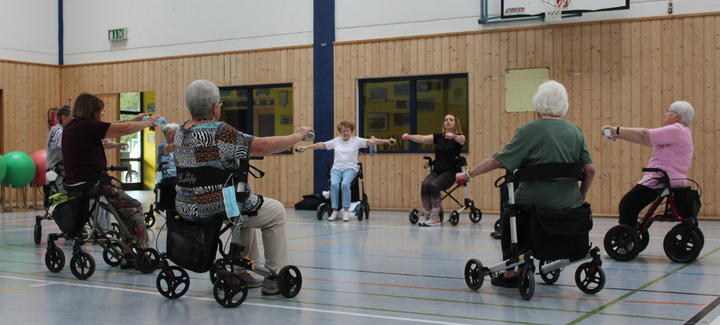 Hanteltraining bei der Rehasportgruppe für Rollatornutzer des VfL Nastätten: Zu Übungszwecken sitzt Kursleiterin Denise Lang (hinten Mitte) ebenfalls auf den Rollator. Foto: Ulrike Bletzer |