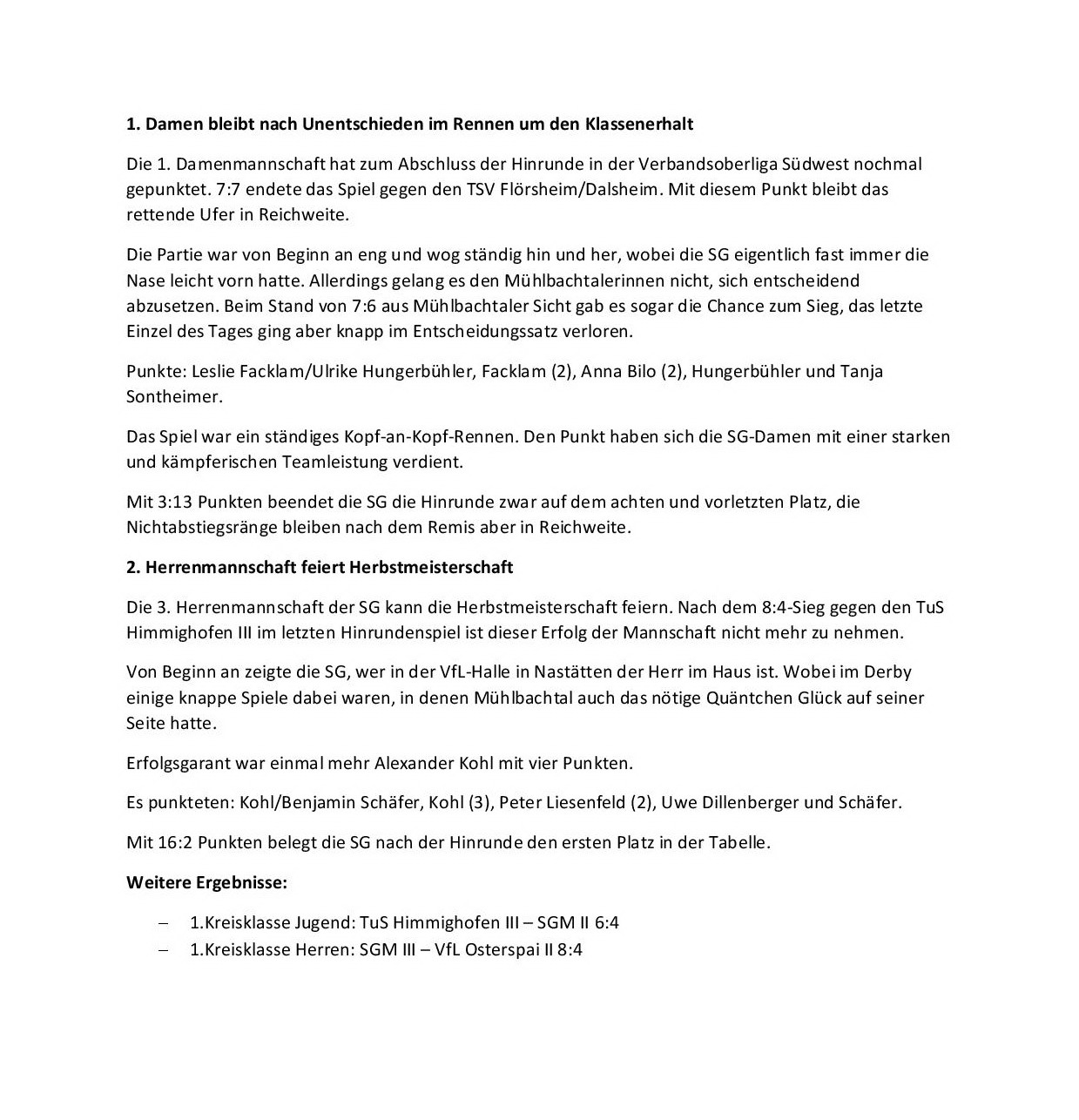 Nistertal II - SG Mühlbachtal 9:3.