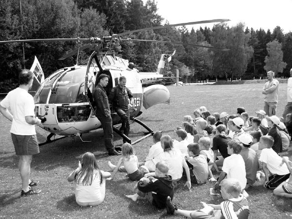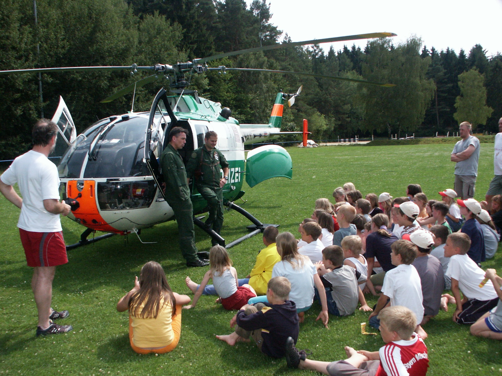 | Das war die Attraktion für die Kinder, als beim Zeltlager des VfL Nastätten ein Polizeihubschrauber auf dem Sportplatz landete. Foto: Thorsten Stötzer | ||