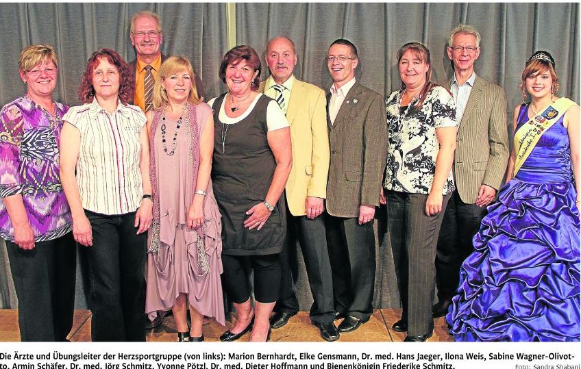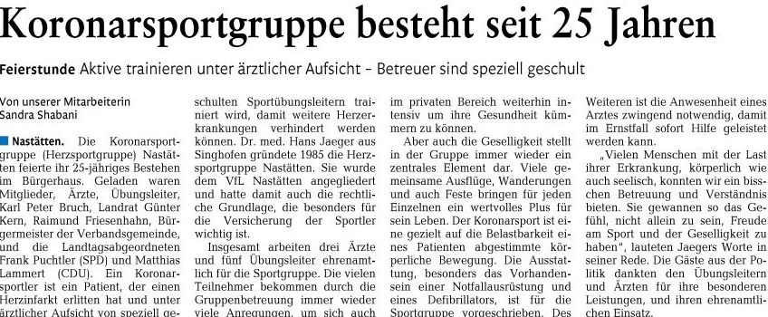 25 Jahre Herzsportgruppe VfL Nastätten e.V.25 Jahre Herzsportgruppe VfL Nastätten In diesem Jahr feiert die Herzsportgruppe des VfL Nastätten ihr 25-jähriges Bestehen. Gegründet wurde die Gruppe 1985 von Carin Priebsch (2005 ?), Dr. Hoffmann, Dr. Jaeger und Wolfgang Korn. Mittlerweile sind weit mehr als 50 Teilnehmer/innen im Alter von 35 - 80 Jahren in unserer Herzsportgruppe vertreten. Betreuende Ärzte sind: M. Grote, Dr. Hoffmann, Dr. Jaeger, Dr. Schmitz und Frau Schröter. Qualifizierte Herzsportgruppen-Übungsleiterinnen sind: Marion Bernhardt, Elke Gensmann, Yvonne Pötzl, Sabine Wagner-Olivotto und Ilona Weis. Die Gruppe trifft sich jeden Mittwoch um 18:15 Uhr in der Kreissporthalle Nastätten und besteht aus insgesamt 3 Einheiten. Die Übungsstunden setzen sich durch Aufwärmen, Gymnastik, Ausdauerspielen und der anschließenden Entspannung zusammen. Unsere Herzsportgruppe verfolgt das Ziel, den Gesundheitszustand und die Lebensqualität von Herz-Kreislauf-Patienten (z. B. nach einem Herzinfarkt oder einer Bypass-Operation) durch regelmäßige körperliche Betätigung, unter Anleitung qualifizierter Übungsleiter/innen und ärztlicher Kontrollen, zu verbessern. Nicht nur Sport trägt zur Verbesserung des Gesundheitszustandes bei, sondern auch das Gesellige, wie z. B. Wanderungen, Grillfeste oder Ausflüge. Anlässlich unseres 25-jährigen Bestehens findet am Samstag, 21. Mai 2011, von 14:00 Uhr bis 18:00 Uhr im Bürgerhaus Nastätten eine Feierstunde statt, zu der alle aktiven und ehemaligen Herzsportgruppenteilnehmer/innen herzlich eingeladen sind.