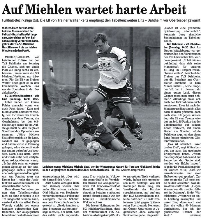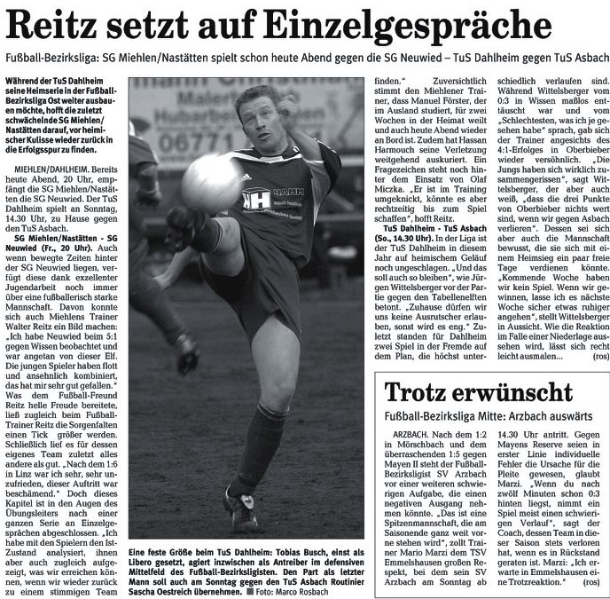 "In dieser Partie sind wir trotz des Heimvorteils lediglich Außenseiter", sagt Reitz und verweist auf die "Riesen-Rückrunde" der Mannschaft von Trainer Jürgen Wittelsberger. "Ich denke, dass die Dahlheimer schon wieder annähernd auf diesem Niveau spielen", warnt Reitz seine Schützlinge, "die zum jetzigen Zeitpunkt eigentlich noch nicht gegen solches Team gewinnen können". Fragt man indes TuS-Übungsleiter Wittelsberger nach den Kräfteverhältnissen, hört sich das gänzlich anders an. "Ein Pünktchen wäre schön, aber es wird verdammt schwer, in Miehlen etwas zu holen", weist auch er die Favoritenrolle von sich. Insbesondere die Einschätzung des Kollegen Reitz, der TuS sei schon wieder auf dem Stand der Vorsaison, will Wittelsberger nicht teilen. "Große Teile der Mannschaft haben noch einen erheblichen Trainingsrückstand. Wir müssen daher versuchen, uns noch vier, fünf Wochen über Wasser zu halten." Entsprechend erleichtert ist der Coach, auch heute im Derby auf seine Standby-Kraft Lothar Hamm vertrauen zu können. "Lothar ist fit und hat beim 3:2 gegen Neuwied ganz stark gespielt", sagt Wittelsberger, der den gesperrten Libero Tobias Busch durch den erfahrenen Sascha Oestreich ersetzen wird. Ohne seinen Routinier im Mittelfeld wird Walter Reitz auskommen müssen. Marinko Valentic hatte sich beim 4:0-Auftaktsieg gegen Ellingen einen Muskelfaserriss zugezogen und wird heute ebenso zuschauen wie der angeschlagene Alexander Keiels. (ros)