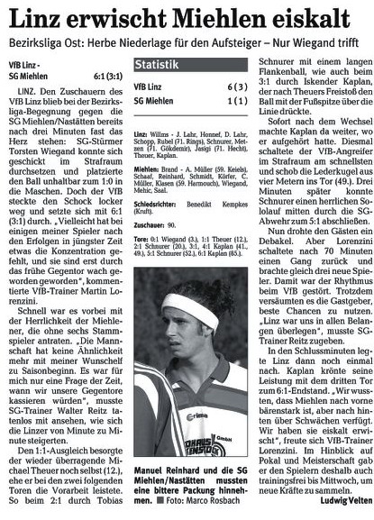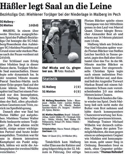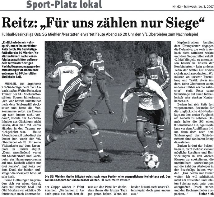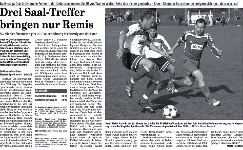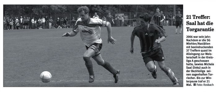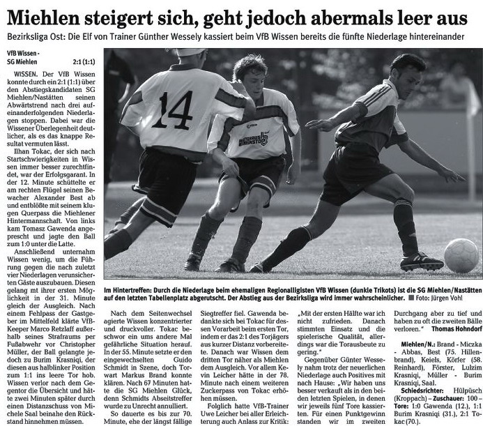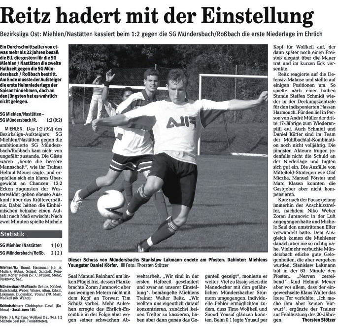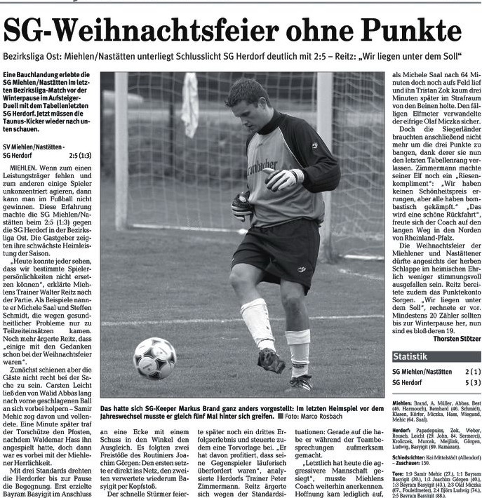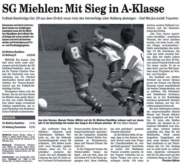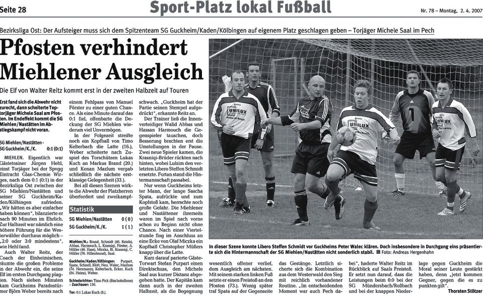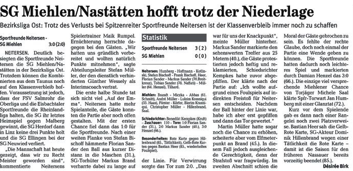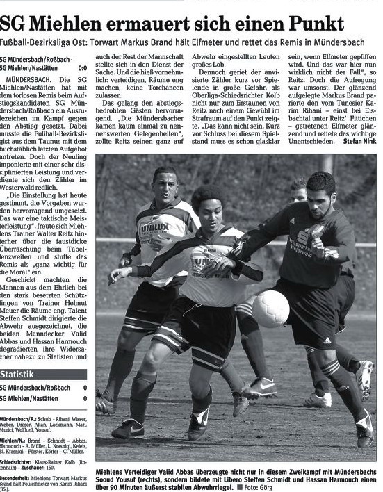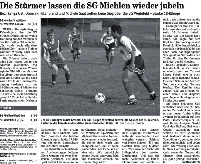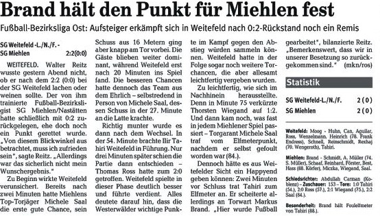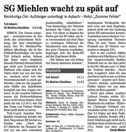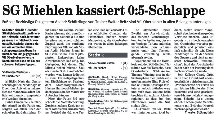 Miehlen/Nastätten: Brand - Schmidt - Harmouch, Abbas - Schaaf, Klasen, Miczka, Förster, Reinhard (88. Mehic) - Juranovic (81. Wiegand), Saal. Schiedsrichter: Matthias Eschenauer (Bad Marienberg). Zuschauer: 103. Tore: 0:1 Thomas Schaaf (69.). |