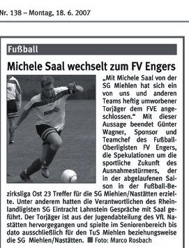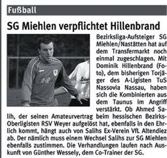Neue für die SG Miehlen/N. Bezirksliga-Aufsteiger SG Miehlen/Nastätten hat für die kommende Runde aufgerüstet: Neben den beiden Eisbachtalern Zoran Juranovic und Hassan Harmouch hat Trainer Walter Reitz auch den zuletzt vereinslosen Routinier Marinko Valentic und Marc Klasen (SG Hambuch/Kaifenheim) und Manuel Reinhard (FSV Welterod) verpflichtet. Aus dem eigenen Nachwuchs rücken Waldemar Hass, Steffen Schmidt und Sven Flemming in den Senioren-kader auf. Verlassen haben die Kombinierten Jan Lentzen (FSV Welterod) und Rüdiger Graden, der künftig seine Tore für TuS Koblenz II schießen wird. Seine aktive Laufbahn beendet hat dagegen Markus Müller. (stn) Rhein-Lahn-Zeitung - Ausgabe Bad Ems, Lahnstein vom 13.07.2006, Seite 27. |