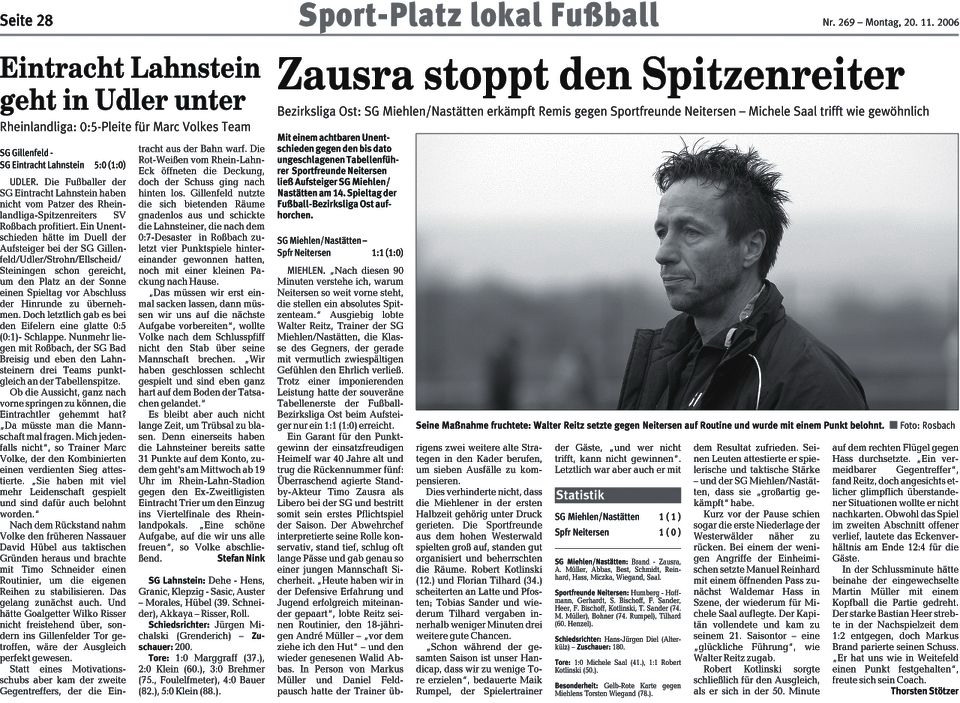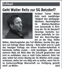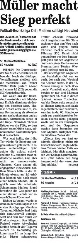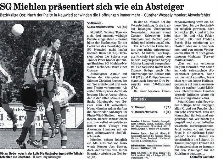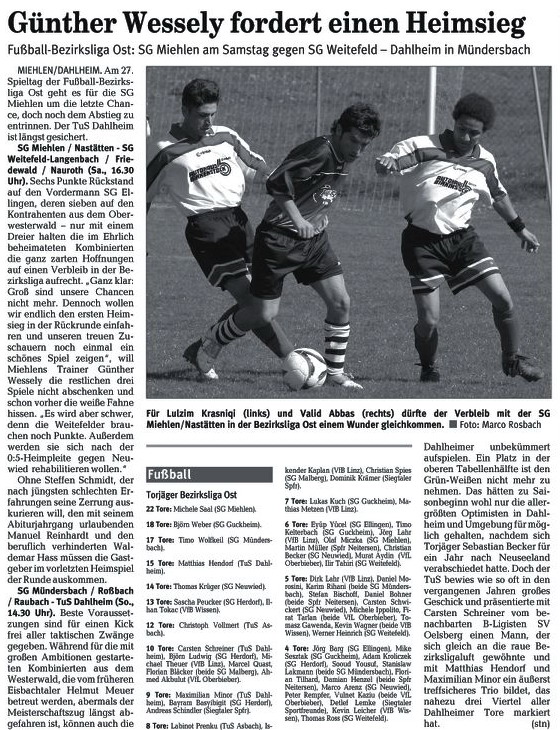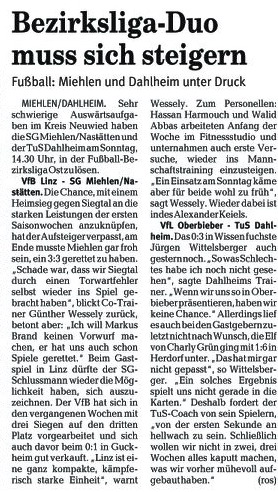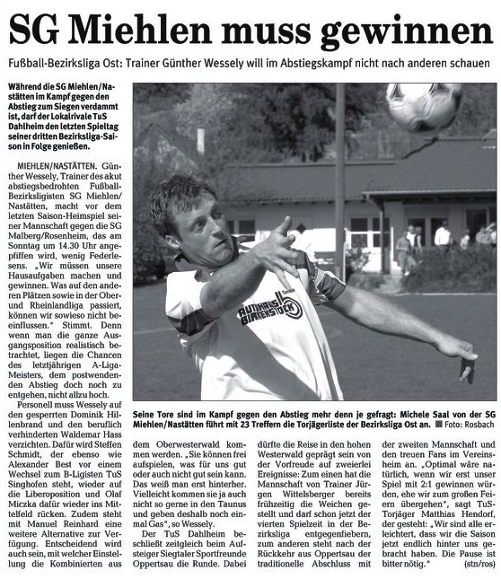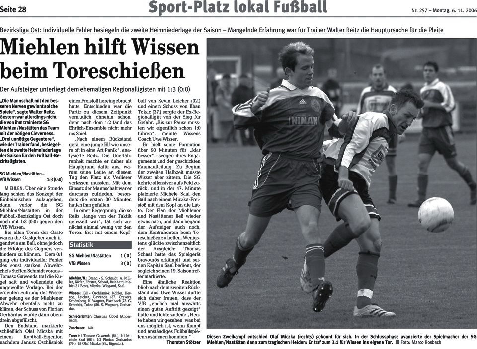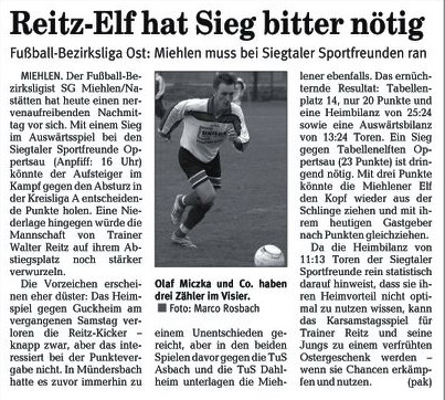 Bezirksliga Ost Sportfreunde Neitersen - SG Miehlen / Nastätten. Miehlens Trainer Günther Wessely, der am Sonntag aus dienstlichen Gründen nicht zur Verfügung stehen und nach eigenen Aussagen vermutlich von Abteilungsleiter Stefan Müller an der Seitenlinie vertreten wird, brach aber nach dem 2:0-Heimsieg gegen die SG Weitefeld nicht in grenzenlose Euphorie aus. "Ein großer Schritt war das nicht, wir haben uns lediglich die Chancen erhalten, doch noch drinzubleiben." Wessely baut darauf, dass die Oberwesterwälder nicht mehr hundertprozentig bei der Sache sind, nachdem sie den Sprung in die Rheinlandliga perfekt gemacht haben. Seit der nämlich fest steht, setzte es zwei Niederlagen. "Darin liegt unsere kleine Chance. Wir müssen uns aber auch darüber im Klaren sein, dass uns wahrscheinlich nur sechs Punkte aus den beiden ausstehenden Spielen weiter helfen, zudem müssen unsere Konkurrenten für uns spielen." Gastgeschenke stellt Sportfreunde-Coach Maik Rumpel jedoch keine in Aussicht. "Wir wollen uns mit einer engagierten und konzentrierten Leistung von unserem Publikum verabschieden und das Spiel gewinnen. Dazu müssen wir allerdings unsere Chancen konsequenter nutzen als letzte Woche in Neuwied", sagt Rumpel, der bis auf den gesperrten Günter Gerhardt alle Spieler an Bord hat. Bei den Miehlenern fehlen werden Dominik Hillenbrand, Manuel Reinhardt und Steffen Schmidt - er wandert zusammen mit Alexander Best zum benachbarten B-Ligisten TuS Singhofen. Dafür steht Waldemar Hass wieder zur Verfügung. Im Gegensatz zu Michael Kapski, der der SG nach einigen Gesprächen einen Korb gegeben hat. Die Trainersuche geht im Ehrlich also wieder von vorne los. |