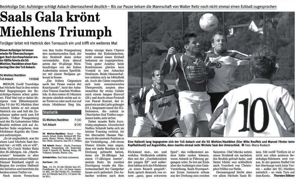 SG Ellingen/B./W. 4:0 (2:0) MIEHLEN. Nur ein Gewittersturm gefährdete zeitweise den Auftaktsieg der SG Mieh-len/Nastätten in der Bezirksliga Ost. Der Aufsteiger gewann im heimischen Ehrlich souverän mit 4:0 (2:0) gegen die SG Ellingen/Bonefeld/ Willroth, doch Trainer Walter Reitz will den "vom Ergebnis her phantastischen Auftakt" nicht überbewerten. "Der Sieg ist etwas zu hoch ausgefallen", fand Reitz und bezeichnete die Führung zur Pause als glücklich, weil sie aus Standardsituationen resultiert hatte. In der Tat zeichneten sich die Gastgeber in einer anfangs ausgeglichenen Partie als Meister der ruhenden Bälle aus. Das 1:0 erzielte Olaf Miczka mit einem Freistoß-Aufsetzer, der in der Tor-ecke landete, für die eigentlich Gäste-Keeper Marcel Spang zuständig sein sollte. Miczka trat auch die erste Ecke der Miehlener, die Kapitän Michele Saal prompt mit einem Kopfstoß vollendete. Dann ging erst einmal gar nichts mehr: Ein Gewitter zog von der Endlichhofener Höhe über das Mühlbachtal und verschuldete eine gut 20 Minuten lange Spielunterbrechung. Ein Sonnenschirm ging im Gewittersturm zu Bruch, doch der Faden riss nicht bei den Einheimischen. Als Ellingens Andreas Fromholz den gerade eingewechselten Manuel Reinhard ungelenk foulte, war Saal beim Strafstoß zur Stelle und markierte seinen zweiten Treffer. Freistoß, Ecke, Elfmeter - als die Taunus-SG alle Standard-Varianten bravourös durchexerziert hatte, erhöhte Zoran Juranovic nach Zusammenspiel mit Saal noch zum 4:0. Dem letzten Tor war ein Fehlpass von Ellingens Spielführer Thomas Rauschenberger voraus gegangen. "Wer die Fehler macht, der verliert das Spiel", analysierte Gäste-Trainer Marc Odink, der das Auftreten seiner Elf in der ersten Halbzeit für eine "Katastrophe" hielt. Ein schweres Jahr komme auf die Mannschaft zu. Erst nach dem Wiederanpfiff kamen die Westerwälder zu zwei Chancen. In der 47. Minute verpasste Christian Holspach knapp, vier Minuten vor dem Ende erzwang Christopher Fleck mit einem Fernschuss eine Glanzparade von Markus Brand - das war alles. Wesentlich besser in Szene setzte sich die Offensive des Ehrlich-Ensembles. Neben Torjäger Saal gefiel vor allem Olaf Miczka als permanenter Antreiber und Spielorganisator. "Trotz der vier Tore halte ich heute aber die Abwehr für überragend. Diese Leistung habe ich denen nicht zugetraut", gestand Reitz. Mit einer neu formierten Dreier-Deckung zeigten die Kombinierten vom Mühlbach dem Rheinlandliga-Absteiger seine Grenzen auf. Hassan Harmouch überzeugte dabei mit Zweikampfstärke und Engagement. Besondere Aufmerksamkeit widmeten die kundigen Beobachter jedoch dem blonden Mann in der Mitte der Verteidigung. Dort gab nämlich der erst 17 Jahre alte Steffen Schmidt ein Debüt als Abwehrchef, mit dem sich das Talent aus der eigenen Jugend für weitere Einsätze empfahl. Thorsten Stötzer