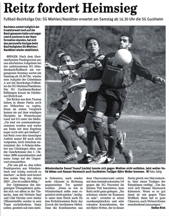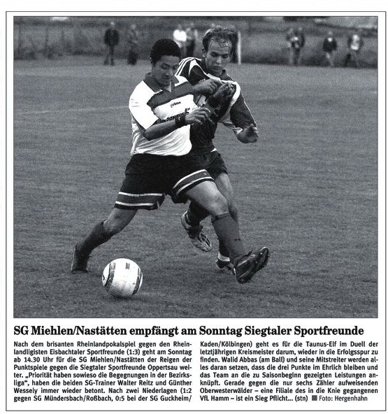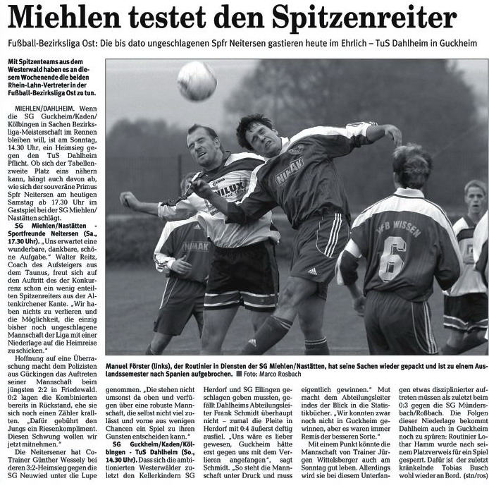 SG Miehlen - SG Ellingen (Sa., 17.30 Uhr). "Endlich geht's los", freut sich Miehlens Coach Walter Reitz auf den ersten Auftritt seiner Mannschaft auf überkreislicher Ebene. Und gleich geht es gegen die Kombinierten aus dem Westerwald, die sich nicht in der Rheinlandliga halten konnten. "Die sind auf jeden Fall zu den Spitzenteams der Liga zu zählen", stuft Reitz die SG, die er zwei Mal persönlich unter die Lupe genommen hat, als Anwärter auf einen der vorderen Plätze ein. "Sie sind konditionell fit und versuchen immer zu spielen", attestiert er den Mannen Marc Odinks ordentliches fußballerisches Potenzial. Seine eigene Mannschaft hat sich nach schwachem Beginn in den vergangenen Wochen stabilisiert. Zuletzt wurde ein Blitzturnier in Eitelborn mit einem Erfolg im Elfmeterschießen gegen die ambitionierten A-Junioren der TuS aus Koblenz gewonnen. "Ansonsten haben uns aber echte Tests gefehlt", so Reitz, der die Siege gegen die A-Ligisten FSV Welterod (6:2) und SV Becheln (1:0) richtig einzuordnen weiß. "Wir stehen am Samstag gleich vor einem absoluten Wegweiser. Nach dem Spiel gegen Ellingen wissen wir, wie die Hunde laufen und ob wir in der neuen Klasse angekommen sind." Personell hat Reitz, der viele neue Spieler und einige Talente aus dem eigenen Bereich eingebaut hat, fast die Qual der Wahl. Der von den Eisbachtaler Sportfreunden gekommene Torjäger Zoran Juranovic wird allerdings nicht von Beginn an auflaufen, da er aus familiären Gründen knapp 14 Tage nicht trainieren konnte.