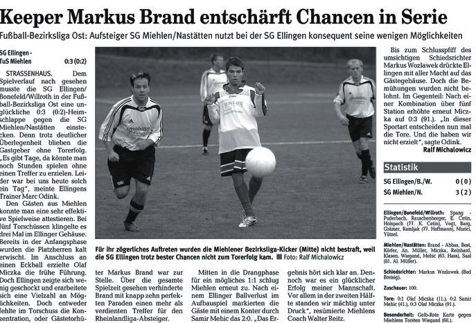 Miehlen/N.: Brand, S. Schmidt, Harmouch, Klasen, Abbas, Keiels, Förster, Valentic (57. Reinhard), Miczka (87. Hass), Wiegand (67. Juranovic), Saal. Ellingen/B./W.: Spang, Fromholz, Praßel, Rauschenberger, Puderbach, Vogt, B. Schmidt (74. Murici), Holspach, Barg (63. May), Ramljak, Yücel (46. Fleck).