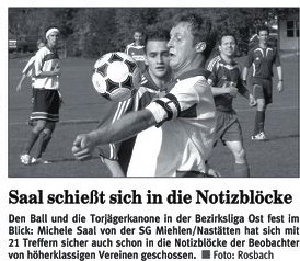 | Michele Saal und der Aufsteiger SG Miehlen/Nastätten starten mit einem Heimspiel gegen Rheinlandliga-Absteiger SG Ellingen in das Abenteuer Bezirksliga Ost. Am dritten Spieltag steht dann das Derby gegen den TuS Dahlheim auf dem Plan. Foto: Rosbach | ||||