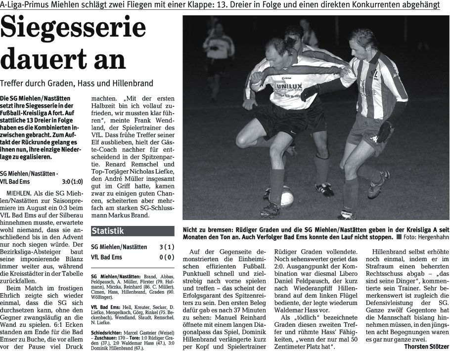 - Miehlen 1:3 FSG Altendiez / Freiendiez / Holzappel / Hirschberg: Simeone, Kolar, Opel, Mohr, Huwer, Knoll (60. Kovac), Schützler, Schmalz, Derdzinski, Schön, Weber. SG Miehlen / Nastätten: Brand, Abbas, Müller, Reinhard, Förster, Miczka, Körfer (88. Wölfinger), Hass, Graden, Feldpausch, Hillenbrand. Tore: 0:1 Olaf Miczka (10., Foulelfmeter), 1:1 Ingo Schön (20.), 1:2 Olaf Miczka (24.), 1:3 Waldemar Hass (78.) - Schiedsrichter: Aslan Basibüyük (Dachsenhausen) - Zuschauer: 100 - Zitat: Aufgrund unserer geschlossenen Mannschaftsleistung haben wir verdient gewonnen", so Gäste-Spielertrainer Rüdiger Graden. 08.09.2007