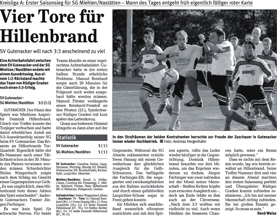 - Gutenacker 3:0 SG Miehlen/Nastätten: Brand, Abbas, Hofmann, A. Müller, Ch. Müller, Miczka (75. Feldpausch), Förster, Cimen, Hass, Graden (83. Wiegand), Hildebrand (60. Flemming). SV Gutenacker: Auster, Diehm, Gapp, Dörner (40. Bruchschmidt), Müller, Richter, Weyhing, Crezelius (46. Winterwerber), Spitz, Kaynak, Kearney. Tore: 1:0 Rüdiger Graden (30.), 2:0 Dominik Hildebrand (60.), 3:0 Olaf Miczka (72.) - Schiedsrichter: Michael Sebastian (Braubach) - Zuschauer: 80 - Vorkommnis: Gelb-rote Karte: Mark Spitz (88., Gutenacker) wegen Meckerns - Zitat: "Ein hochverdienter Sieg für die Mannschaft, also ein klasse Start in die Rückrunde", freute sich Trainer Rüdiger Graden, Miehlen. Sa. 08.03.2008 |
