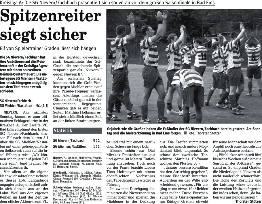 - Welterod 3:5 SG Miehlen/Nastätten: Hoffmann, Feldpausch, Körfer, Abbas (70. Cimen), A. Müller, C. Müller, Miczka, Förster, Reinhardt (46. Graden), Wiegand, Hillenbrand. FSV Welterod: Weiler, Maxeiner, B. Koch, Bender, Sascha Steeg, Schulte, Pohl (60. Gombert), Sandy Steeg, Siegel, Schneider (70. Wieland), F. Koch. Tore: 0:1 Jean-Manuel Schulte (16.), 1:1 Torsten Wiegand (31.), 1:2 Sandy Steeg (31.), 2:2, 3:2 beide Dominik Hillenbrand (52., 60.), 3:3 Sandy Steeg (58.), 3:4 Mathias Wieland (70.), 3:5 Holger Siegel (86.) - Schiedsrichter: Sinan Kilic (Diez) - Zuschauer: 100 - Vorkommnis: Rote Karte: Mathias Wiegand (93., Welterod) wegen Nachtretens - Zitat: "Man kann stolz auf die Mannschaft sein", lobte Trainer Ulf Wenz, Welterod, nach dem überraschenden Erfolg beim Titelanwärter. So. 27.04.2008 |