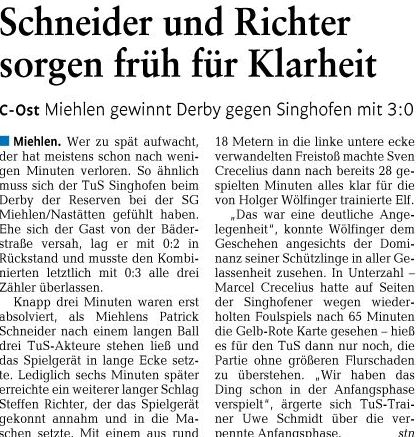 (2:1). Tore: 1:0 Phaitun Muharan (5.), 2:0 Patrick Schneider (12.), 2:1 Sascha Wolf (40.), 2:2 Francesco Tomasello (55.), 2:3 Björn Rhode (75.) Schiedsrichter: Ralf Heuser (Allendorf). Zuschauer: 25. Zitate: „Ab der 17. Min wurde das Fußballspielen eingestellt. Ein grottenschlechtes Spiel“, so Holger Wölfinger, Trainer von SG Miehlen. |