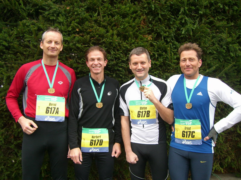 Schon seit einigen Jahren nehmen die Läufer des VfL Nastätten immer wieder an Laufveranstaltungen nicht nur in der Region, sondern auch an Marathonveranstaltungen z.B. in Hamburg, Berlin, Köln, Mainz und andere teil. Am 29. Oktober besuchte man den Frankfurt Marathon und stellte sich dort im Wettbewerb dem Staffelmarathon. Der Staffelmarathon erfreut sich seit Einführung des Wettbewerbs zur Hauptveranstaltung, dem Frankfurt Marathon immer grösser werdender Beliebtheit. Hierbei gilt es mit 4 Läufern in jeweils unterschiedlich langen Teilstrecken die gesamte Marathondistanz von 42,195 km zu bewältigen. Die kürzeste Distanz betrug 6,5 km, die längste 13,5 km. Ein Staffelholz in Form eines Armbandes musste in den Wechselzonen an den nächsten Läufer des Staffelteams übergeben werden, und unbeschadet ins Ziel gebracht werden. Insgesamt nahmen 947 Staffeln am Frankfurt Marathon teil. Das Staffelteam vom Lauftreff des VfL Nastätten, Bernd Kreisel, Norbert Lenz, Stefan Michel und Ernst Michel Liefen in beachtlichen 2:57:09 Std auf den 15. Platz in der Gesamtwertung Staffel. - Herzlichen Glückwunsch –