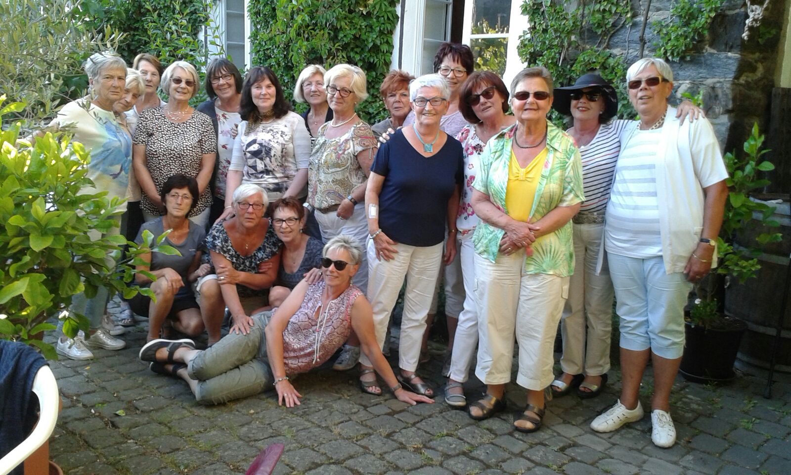 Damen – Gymnastik Neustart nach Corona. Gymnastik im Freien mit der Übungsleiterin Gudrun Gerhards mit Abstand in ihrem Hof Super Gymnastik und Trinkpause mit Schwaller Wasser. 15.06.2020 |