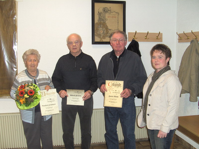 von links nach recht: Anneliese Holzhäuser (75), Alfred Heuser (60), Horst Klein (25)u 2.Vors. Steffi Michel |