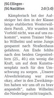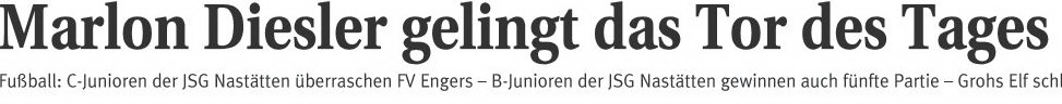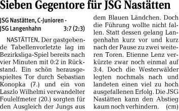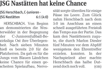 JSG Nastätten, C-Junioren - JSG Hahnstätten 1:1 (1:1) NASTÄTTEN. Hart zur Sache ging es bei der C-Junioren-Partie zwischen den Bezirksligisten JSG Nastätten und JSG Hahnstätten. In den ersten 15 Minuten der Begegnung dominierten die Gastgeber, die immer wieder durch Marius Haxel und Marlon Diesler auf der rechten Seite den Gegner von der Aar unter Druck setzten. Die Führung durch Marius Haxel war die verdiente Konsequenz (13.). Doch nur drei Minuten später schalteten die Jungs vom Blauen Ländchen zu spät vom Angriff auf Verteidigung um und Marvin Biehl besorgte den Ausgleich für die Heideberger. Von da an beherrschten harte Zweikämpfe das Bild auf dem Rasen. Der erst kurz zuvor eingewechselte Christian Kreckel musste kurz vor der Halbzeit mit einer ausgekugelten Schulter ins Krankenhaus eingeliefert werden. Nach der Pause erspielte sich das Team von Marko Wilhelmi zwar immer wieder Chancen, doch am gegnerischen Strafraum haperte es. Stattdessen stockte Nastättens Trainer der Atem bei einigen brenzligen Situationen vor dem eigenen Tor, in dem Jörn Ruthmann stand. Letztlich gab"s ein gerechtes Unentschieden. Rhein-Lahn-Zeitung - Bad Ems, Lahnstein vom Freitag, 18. September 2009, Seite 12. |